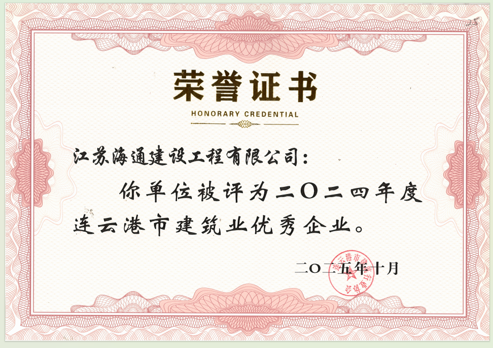 近日,連云港市建筑行業(yè)協(xié)會發(fā)布了2024年度建筑業(yè)優(yōu)秀企業(yè)、優(yōu)秀經(jīng)理及優(yōu)秀項目經(jīng)理評價結(jié)果。江蘇海通建設(shè)工程有限公司獲評“2024年度連云港市建筑業(yè)優(yōu)秀企業(yè)”,公司黨委書記、董事長于振國同志獲評“2024年度連云港市建筑業(yè)優(yōu)秀經(jīng)理”。