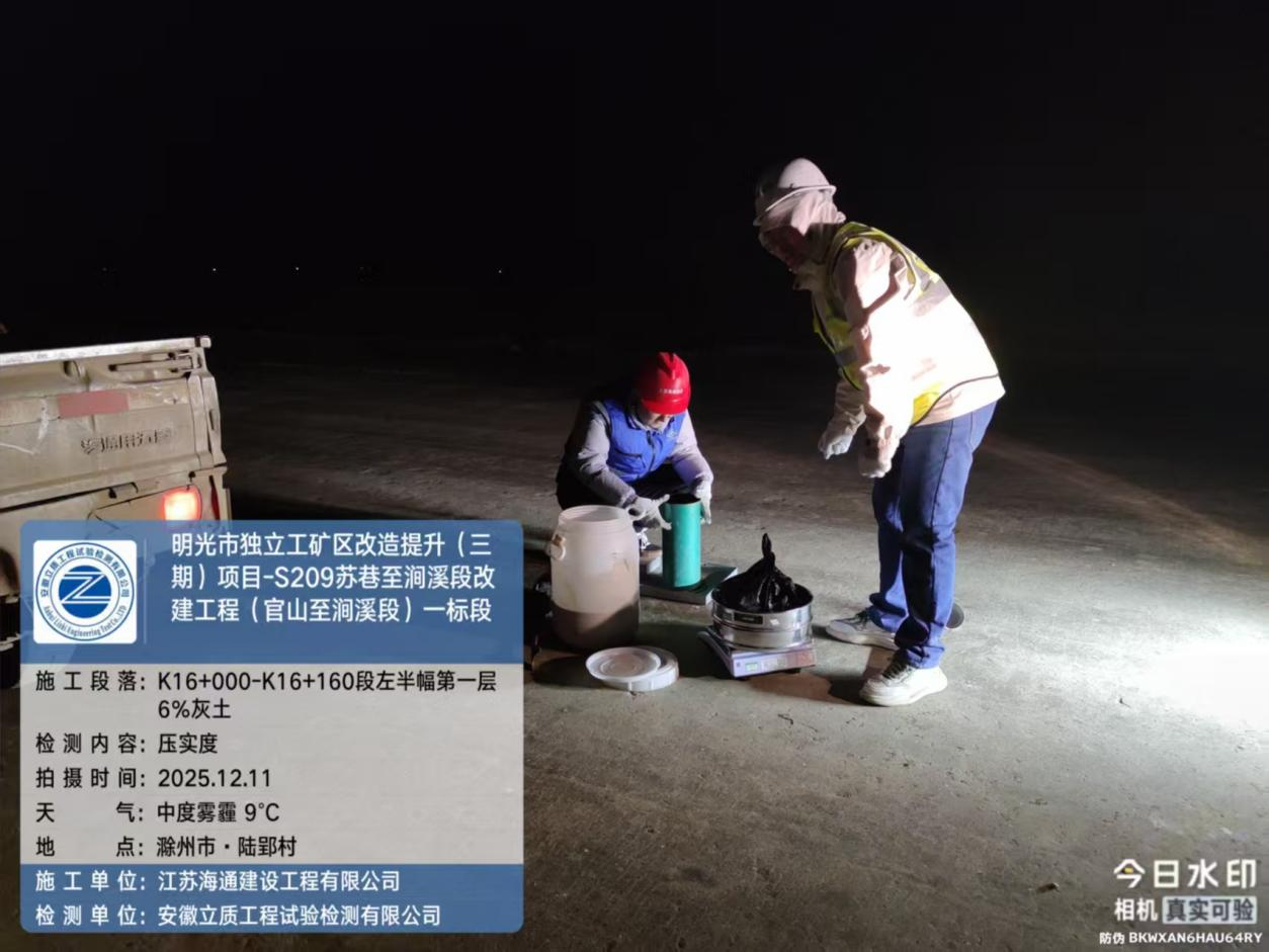 近日,江蘇海建S209蘇巷至澗溪段改建工程(官山至澗溪段)一標(biāo)段項(xiàng)目部試驗(yàn)室連同第三方檢測,組織對K16+000-K16-160左半幅第一層6%灰土壓實(shí)度檢測。