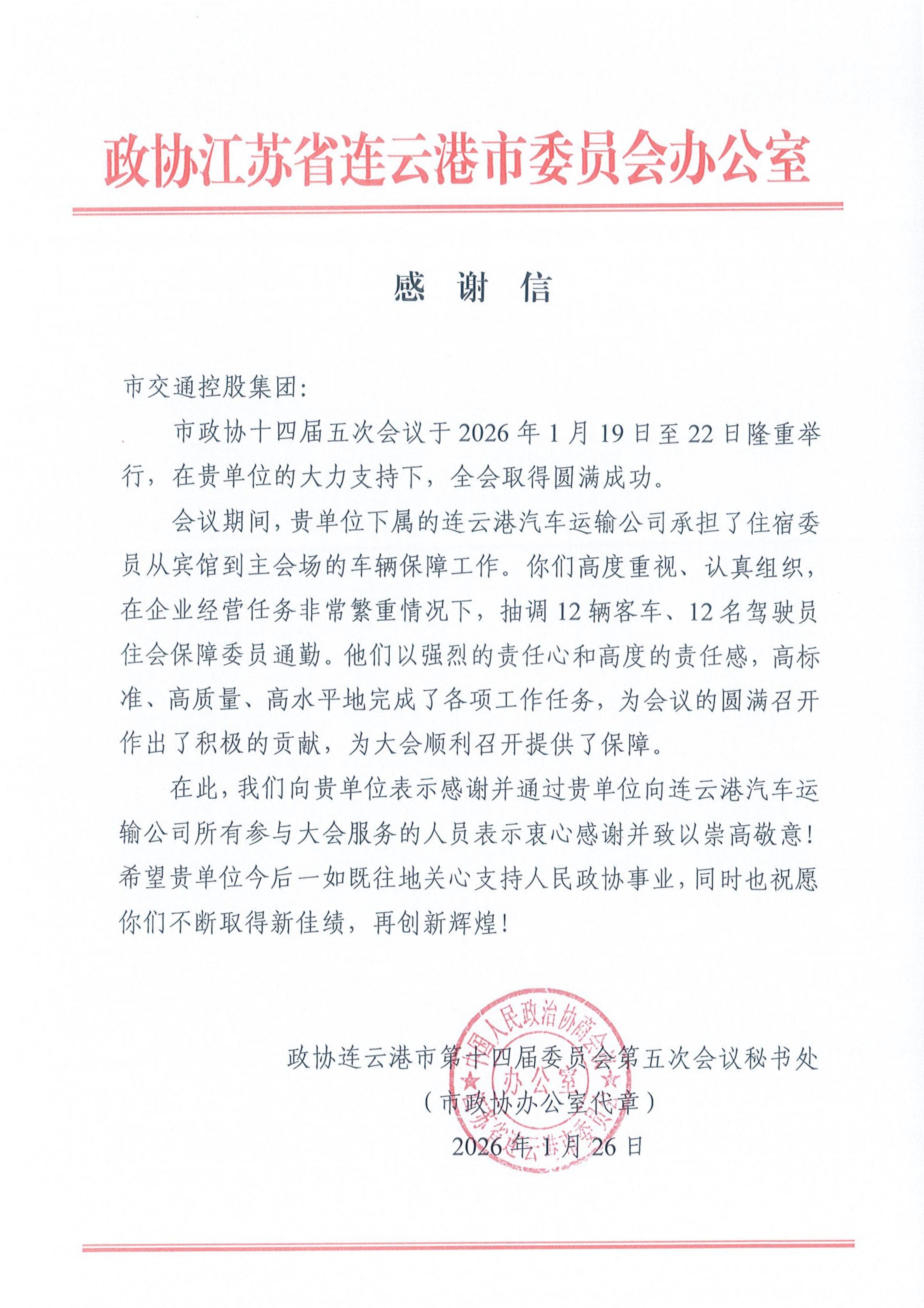 近日,連云港市交通控股集團(tuán)收到了連云港市政協(xié)的感謝信,對交通控股集團(tuán)和集團(tuán)權(quán)屬連云港汽車運(yùn)輸有限公司在市政協(xié)十四屆五次會議期間的組織保障工作給予了高度評價(jià)。