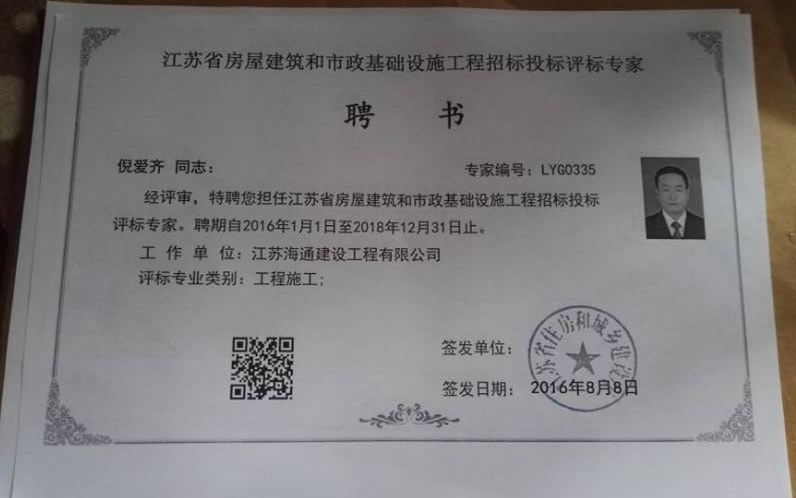 2017年10月17日,從江蘇省住房和城鄉(xiāng)建設(shè)廳獲悉,江蘇海通公司倪愛(ài)齊同志被聘為江蘇省房屋建筑和市政基礎(chǔ)設(shè)施工程招標(biāo)投標(biāo)評(píng)標(biāo)專家,專家編號(hào):LYG0335 ,聘期到2018年12月31日。此次專家申報(bào),增強(qiáng)了江蘇海通公司的投標(biāo)能力,擴(kuò)大了江蘇海通公司的社會(huì)知名度。