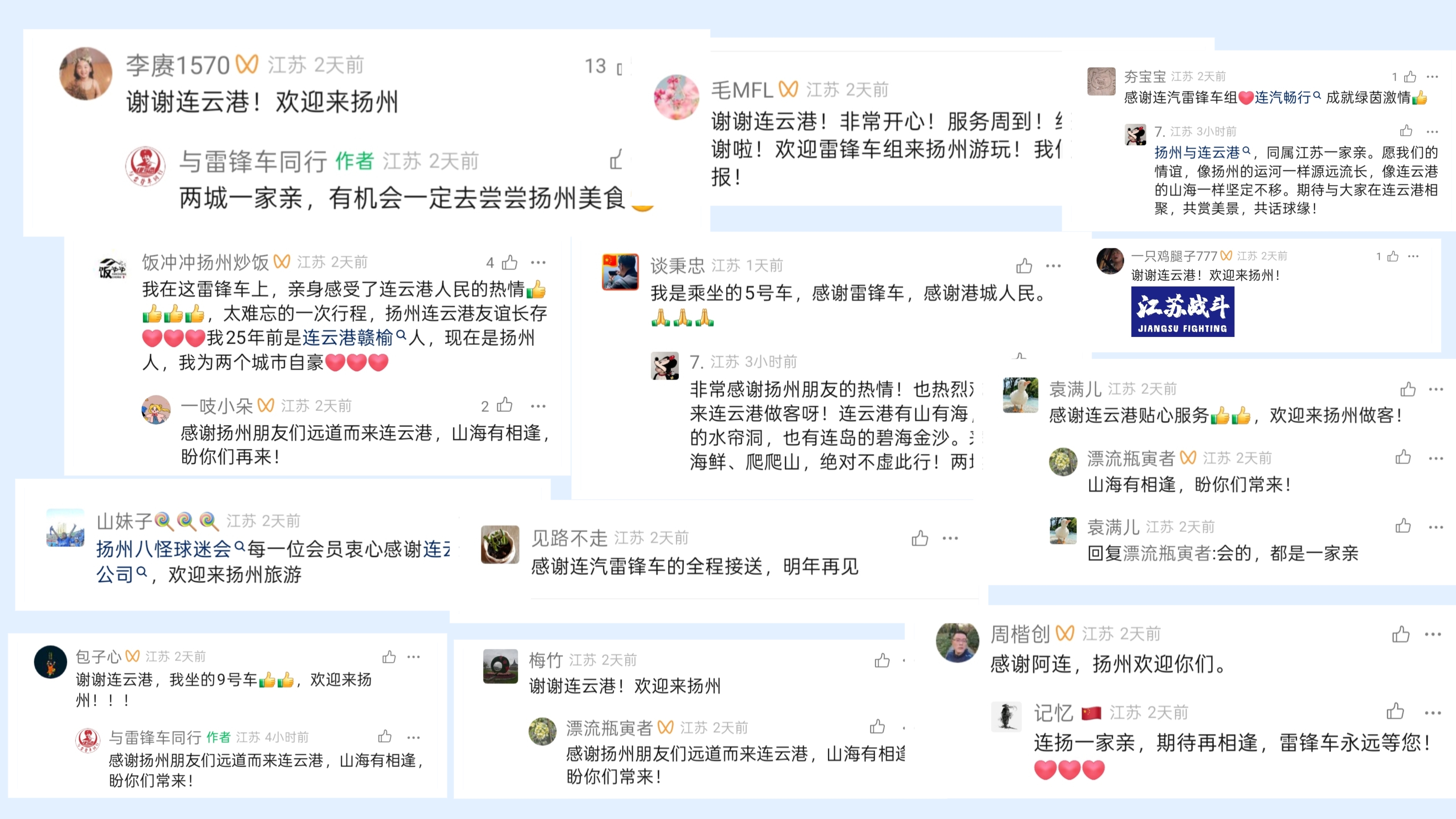 賽事落幕,溫暖卻在延續(xù)。賽后,揚(yáng)州球迷紛紛在社交平臺留下真摯留言,字里行間滿是感動(dòng)與謝意:“謝謝連云港!歡迎來揚(yáng)州?!薄啊卒h車’讓我親身感受了連云港人民的熱情,太難忘的一次行程,揚(yáng)州連云港友誼長存!”“謝謝連云港!非常開心!服務(wù)周到!細(xì)致用心!謝謝啦!歡迎‘雷鋒車’組來揚(yáng)州游玩!我們一定熱情回報(bào)!”“連汽的優(yōu)質(zhì)服務(wù)必須點(diǎn)贊!阿連‘雷鋒車’友誼地久天長!”這些樸實(shí)的話語,不僅是球迷對“雷鋒車”組服務(wù)的認(rèn)可,更是對連云港城市文明形象的由衷褒獎(jiǎng)。