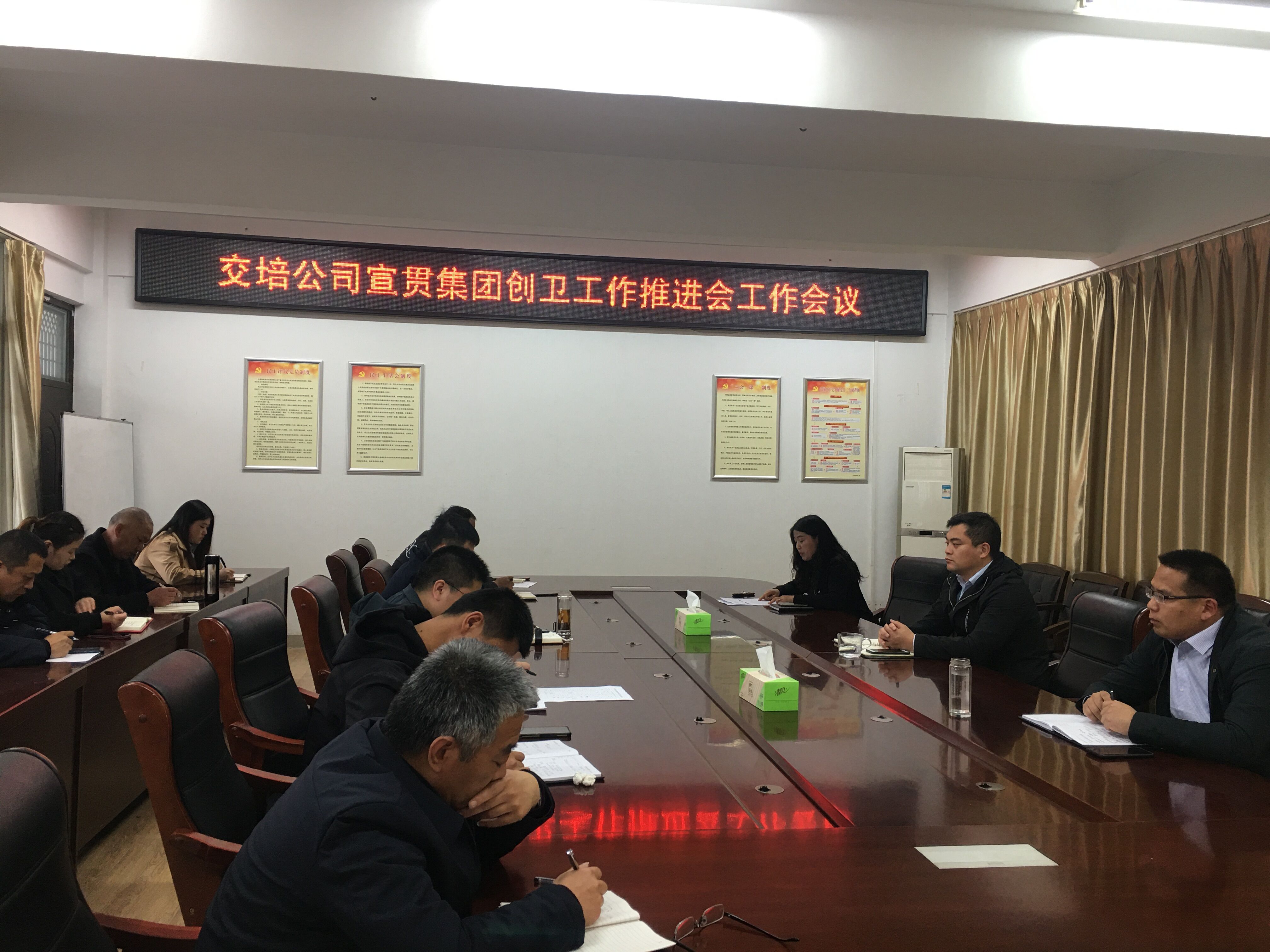 4月2日下午,交培公司召開傳達(dá)集團(tuán)迎接國(guó)家衛(wèi)生城市復(fù)審工作推進(jìn)會(huì),會(huì)議傳達(dá)了集團(tuán)創(chuàng)衛(wèi)復(fù)審工作推進(jìn)會(huì)精神,公司領(lǐng)導(dǎo)、中層干部參加會(huì)議。