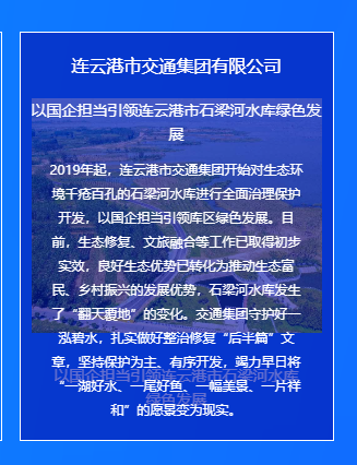 近年來,連云港市交通控股集團(tuán)權(quán)屬交通集團(tuán)按照“生態(tài)+,交通+,文旅+,產(chǎn)業(yè)+”理念,持續(xù)為石梁河水庫“療傷”,以懸壺濟(jì)世的民本情懷妙手回春,守護(hù)一泓碧水,彰顯國企擔(dān)當(dāng),著力將其打造為連云港市第三張旅游名片,實(shí)現(xiàn)看海、觀湖、游花果山愿景,讓習(xí)近平總書記“綠水青山就是金山銀山”的科學(xué)論斷成為生動(dòng)實(shí)踐,被江蘇省委書記吳政隆評(píng)價(jià)為“把良好生態(tài)優(yōu)勢(shì)轉(zhuǎn)化為推動(dòng)生態(tài)富民、鄉(xiāng)村振興的發(fā)展優(yōu)勢(shì)”。